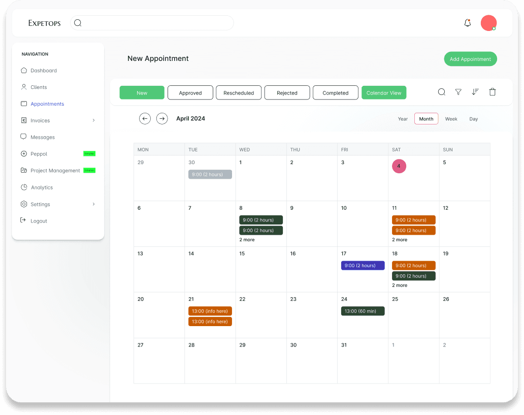 Appointments, clients, projects, and Peppol compliant invoicing.